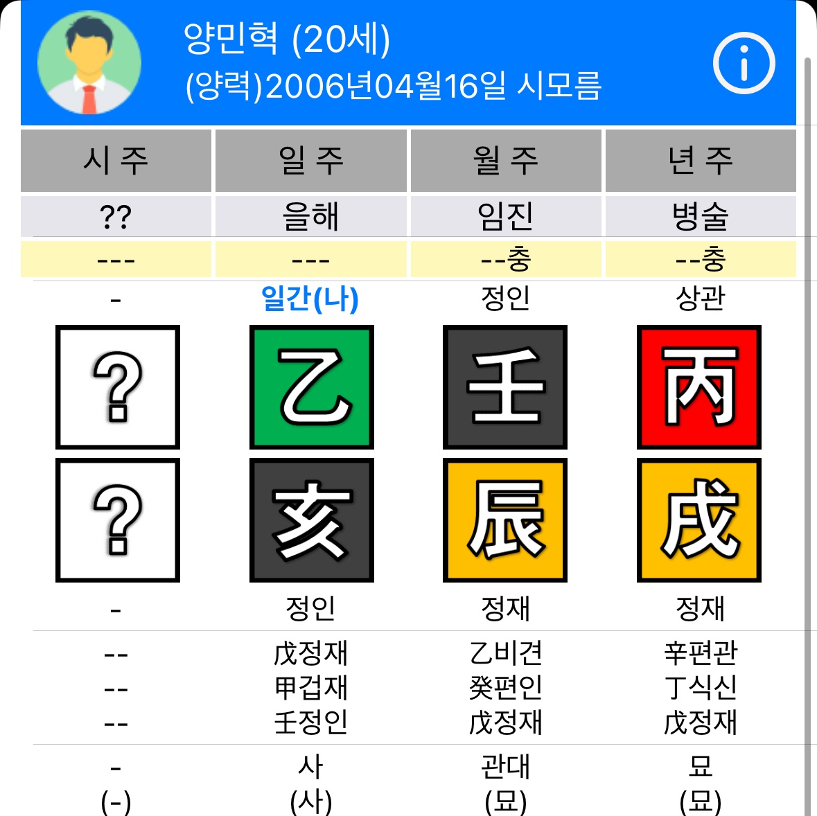 양민혁 선수는 2006년 4월 16일생, 시주는 알 수 없지만 일주가 을해(乙亥)입니다. 을목은 부드럽지만 끈기 있는 성질을 지니고 있어요. 성실하고 성장 욕구가 강하며, 새로운 환경에 적응력이 뛰어납니다.