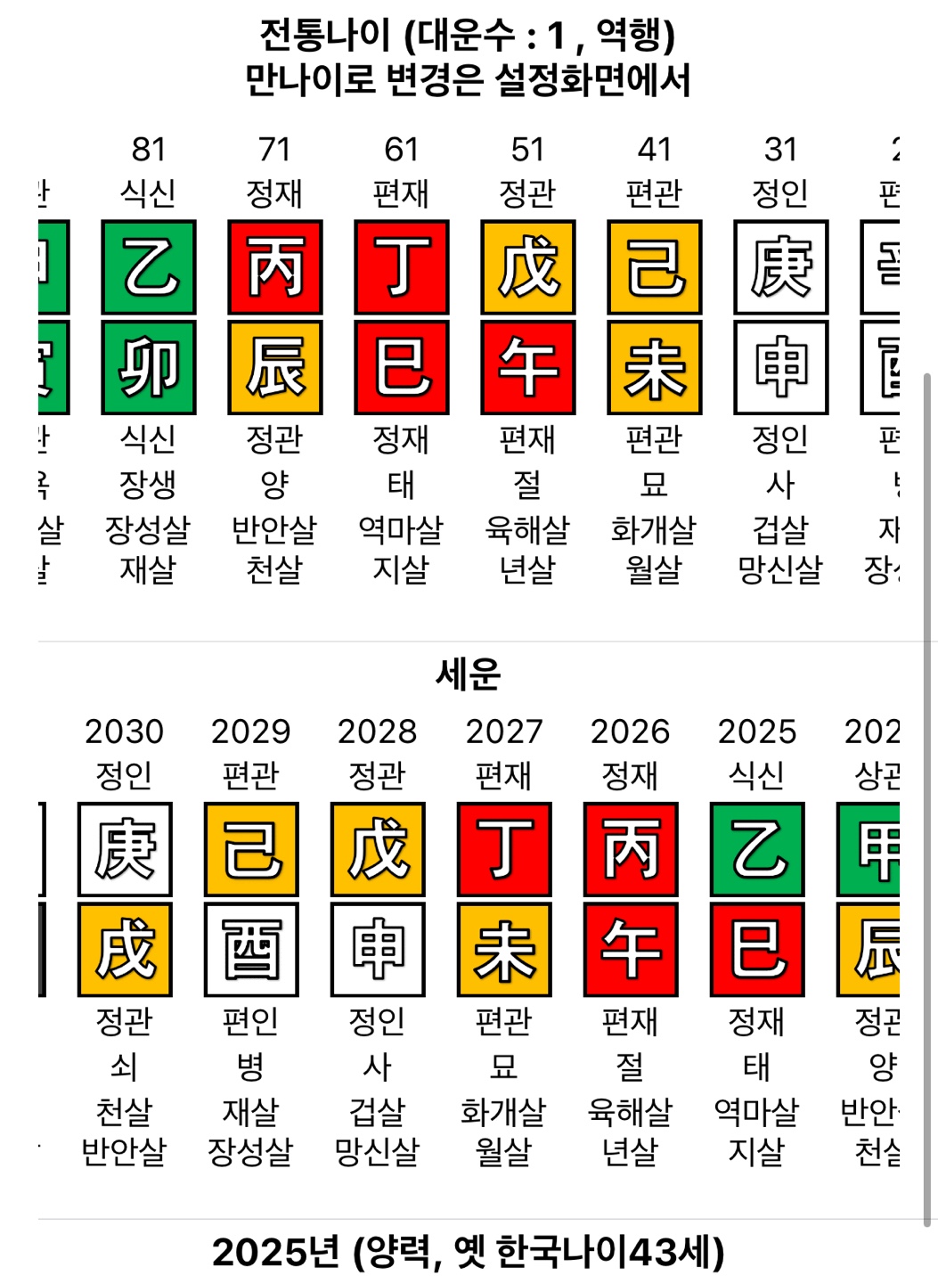 - 현재 40대는 관성 대운으로, 책임과 제도가 강화되는 시기입니다. 장기 시리즈 주연, 제작·프로듀싱 참여 등 공식적인 역할이 늘어납니다. 결혼과 가정의 제도적 안정과도 연결되는 흐름입니다.