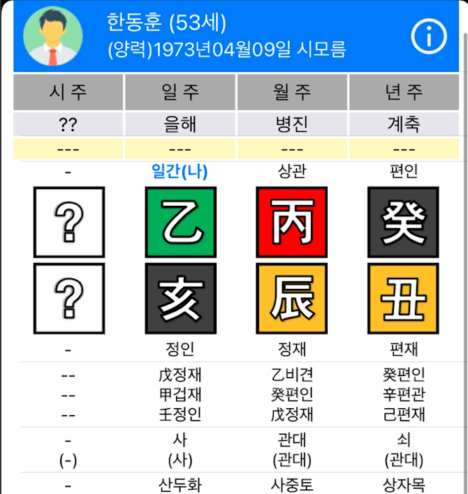 1973년 4월 9일 시모름 기준으로 한동훈 전 대표의 일간은 을목(乙)입니다.